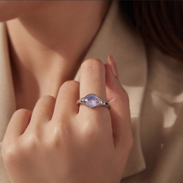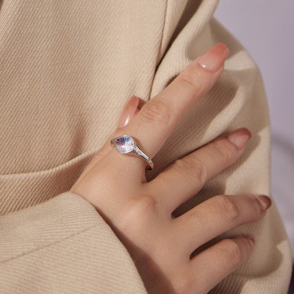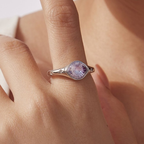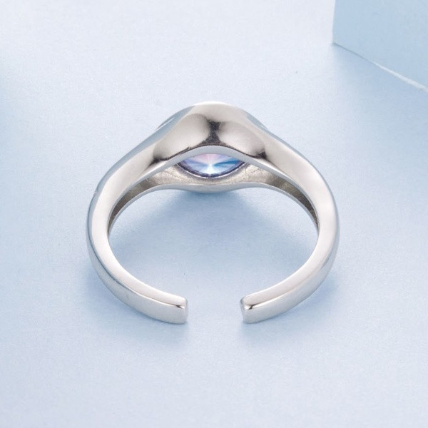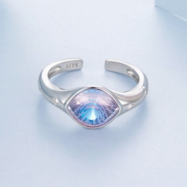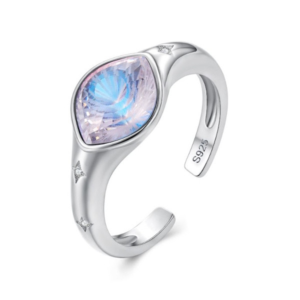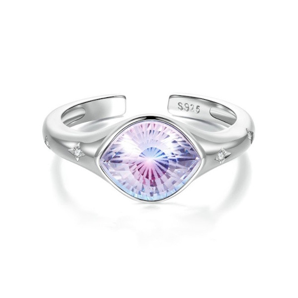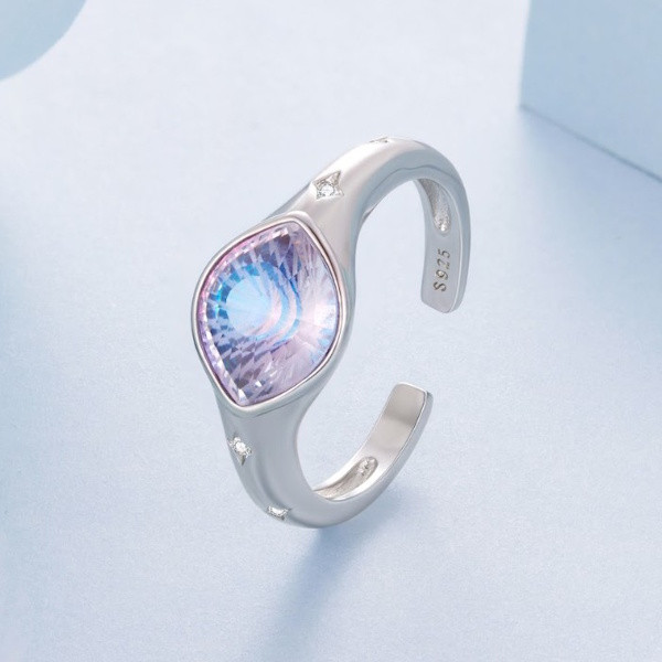 Ezüstből készült, állítható méretű női gyűrű fehérarany-bevonattal és cirkóniumkristállyal. Szélessége 0.24-0.9 cm, súlya 3.7 g.