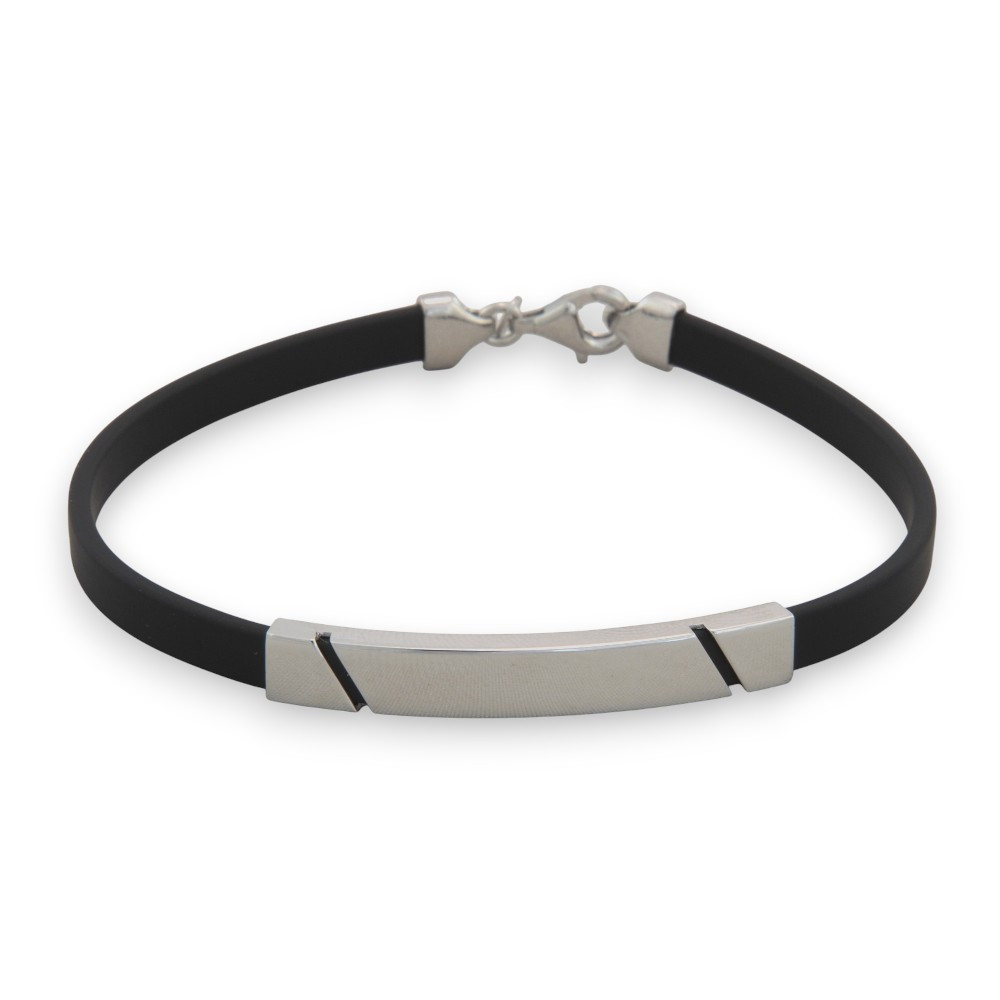 Ez az ezüst karkötő tökéletes választás a modern, városi stílus kedvelőinek. A 925 sterling ezüstből készült karkötő fekete kaucsuk szíjjal rendelkezik, amely nemcsak rugalmas, hanem kényelmes is, így ideális mindennapi viselethez. A matt-fényes kontrasztú, egyenes vonalú ezüst betét minimál és letisztult megjelenést kölcsönöz, miközben az elegáns csillogásával finom eleganciát sugároz.