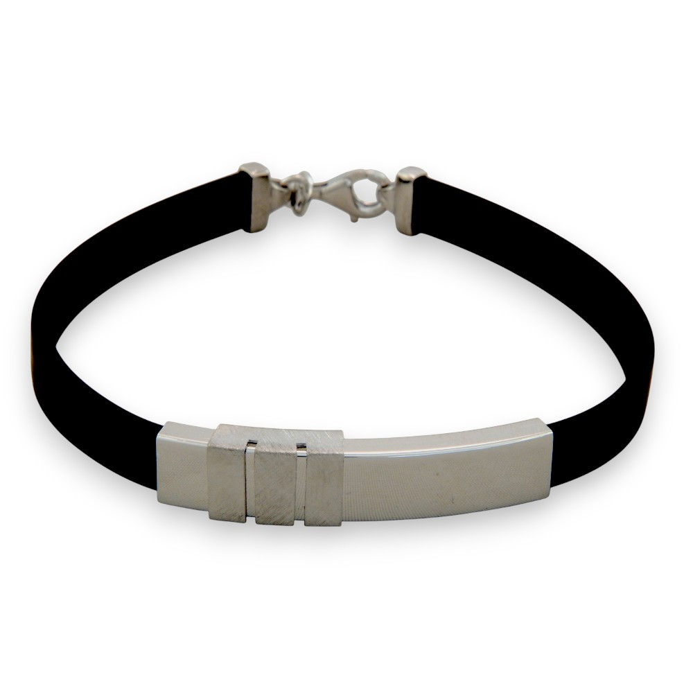 Ez az ezüst karkötő kaucsuk szíjjal a modern elegancia és a praktikum tökéletes találkozása. A fekete szilikon szíj és a geometrikus formákkal díszített ezüst betét együttesen sugároznak erőt és kifinomultságot, így bármilyen öltözékhez remekül passzolnak. A karkötő letisztult vonalai és apró részletei teszik igazán különlegessé ezt a kiegészítőt.
