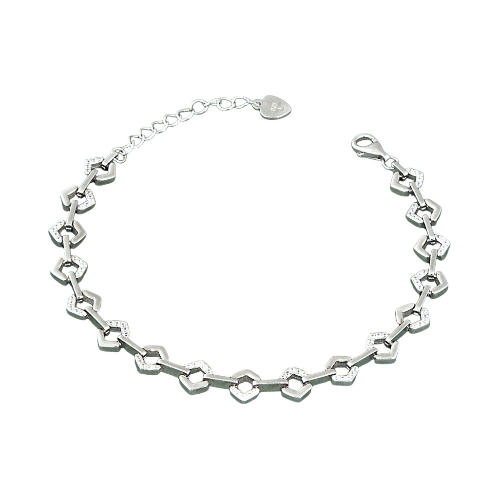Keresel egy igazán különleges és modern ékszert? Ez a lenyűgöző ezüst karkötő a letisztult geometria és a finom elegancia tökéletes találkozása. A lánc egyedi dizájnját az egymáshoz kapcsolódó, nyitott, ék alakú szemek és az azokat összekötő sima, fényes ezüst pálcikák harmonikus váltakozása adja. A geometrikus formák egyik oldalát finoman megmunkált, szikrázó, köves felület díszíti, amely minden mozdulatnál gyönyörűen veri vissza a fényt.