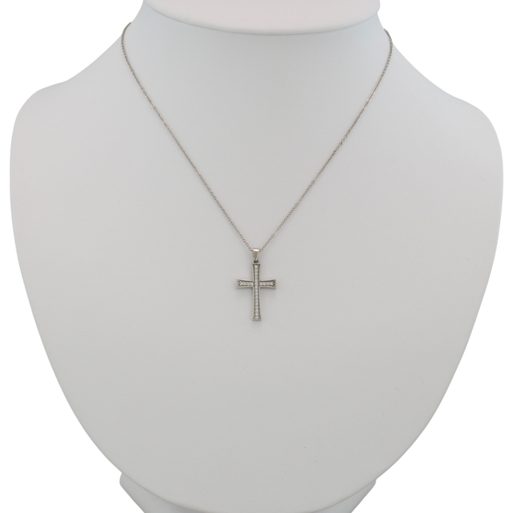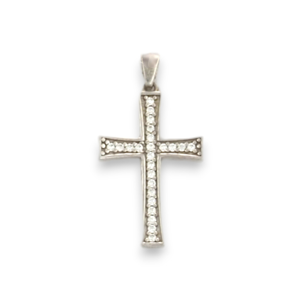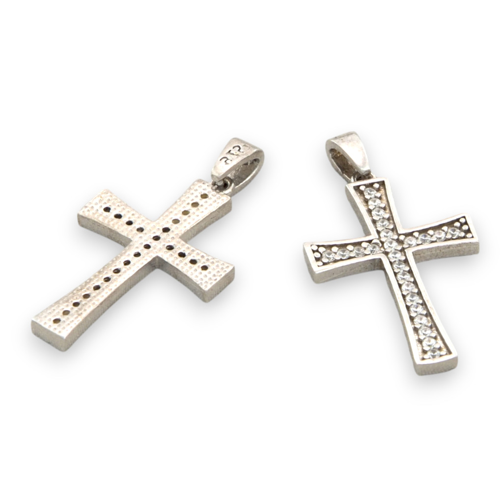 A felületét csillogó, apró kövekkel díszítették, amelyek elegánsan kiemelik a kereszt vonalait, és időtálló fényt kölcsönöznek az ékszernek.