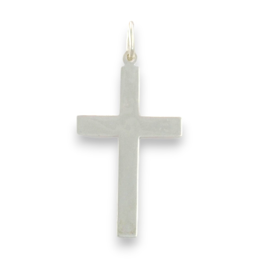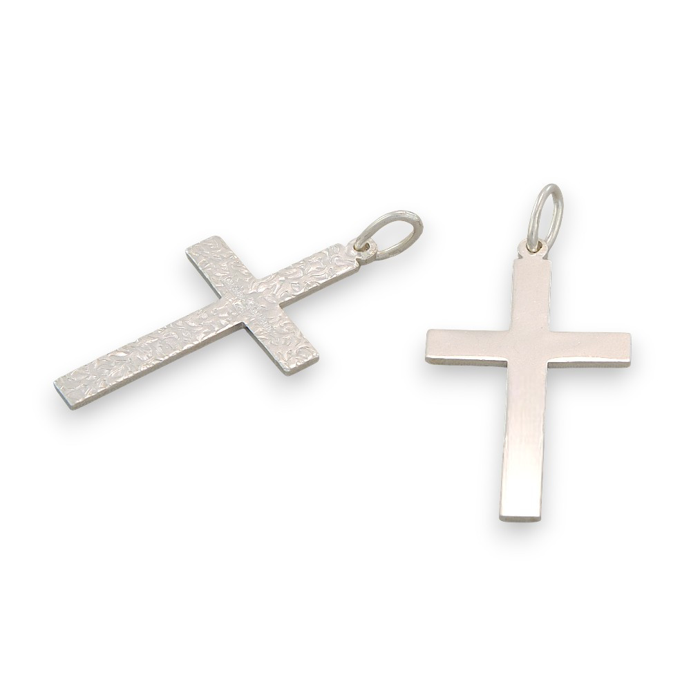 Ez a 925 sterling ezüstből készült kereszt medál a klasszikus formavilágot ötvözi a modern letisztultsággal. Mérete kb. 45×25 mm, így határozott megjelenésű, kifejezetten feltűnést keltő viselet. Az egyik oldala sima, fényes felületű, míg a másik díszített mintázatot kapott – így viselője hangulatától függően választhatja, melyik oldalát szeretné megmutatni.