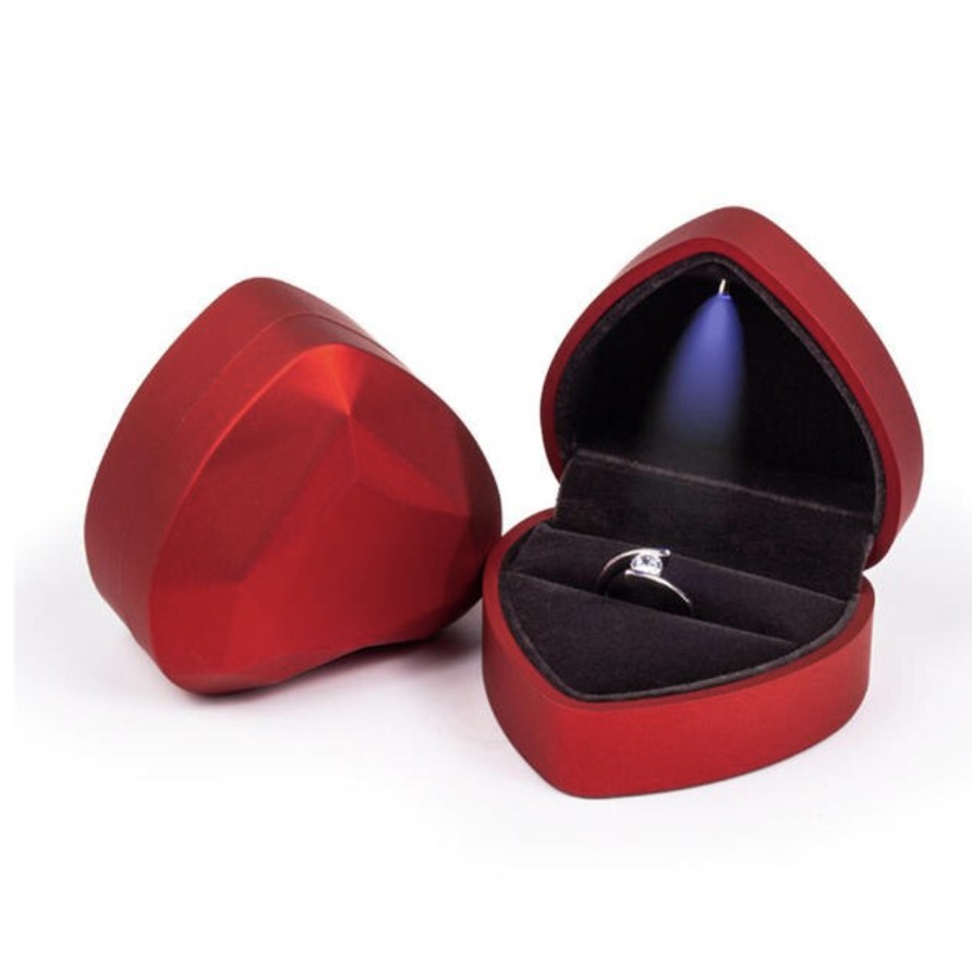 Prémiová šperkovnica na prstene v tvare srdca s LED osvetlením, červená