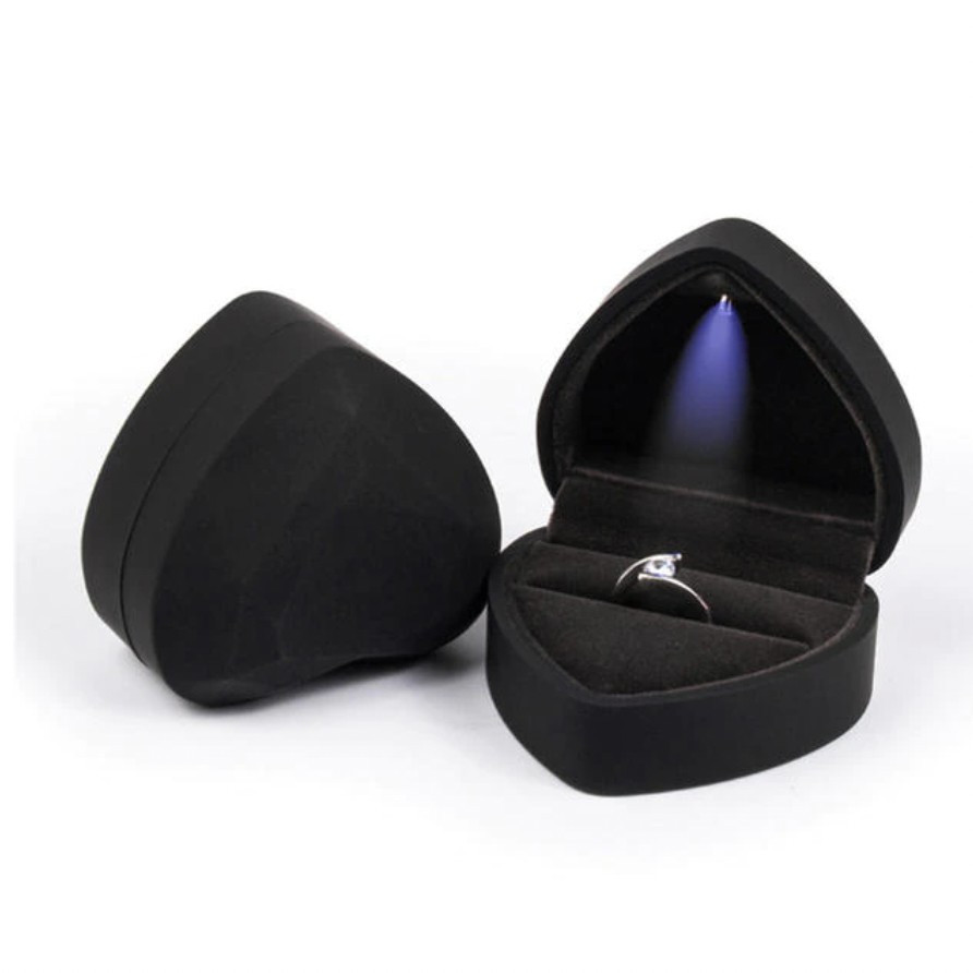 Prémiová šperkovnica na prstene v tvare srdca s LED osvetlením, čierna