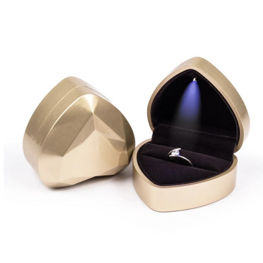 Prémiová šperkovnica na prstene v tvare srdca, s LED osvetlením, zlatá farba
