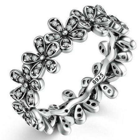 Módny prsteň zo striebra s kvetinovým vzorom, so zirkónovými kamienkami.