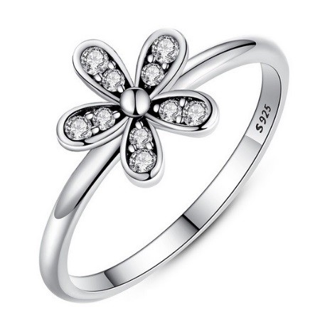 Elegantný štýl, strieborný prsteň s kvetinovým vzorom, so zirkónovými kamienkami.