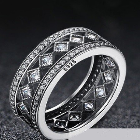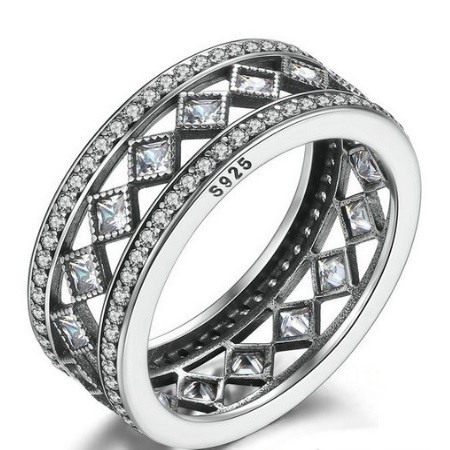 Elegantný štýl, strieborný prsteň, zdobený kamienkami.