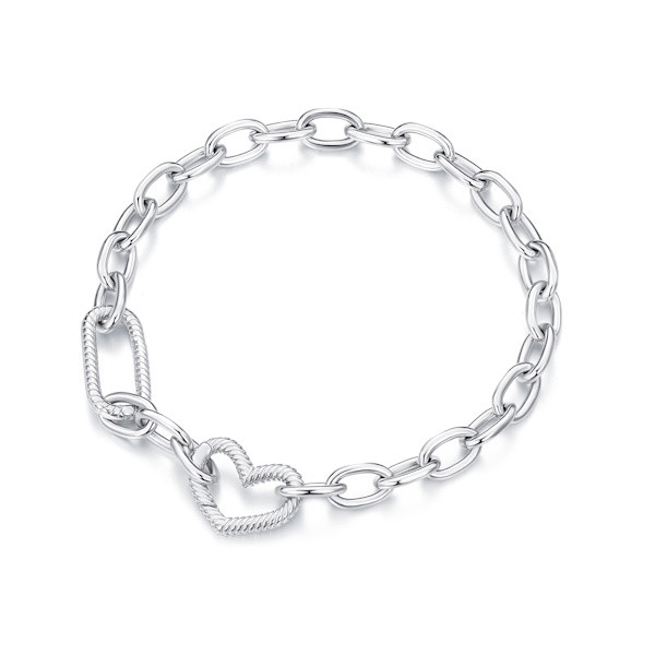 Ez az elegáns, 925 sterling ezüstből készült karkötőalap tökéletes kiegészítője lehet bármely női ékszergyűjteménynek. A platinabevonat különleges fényt kölcsönöz neki, így akár önmagában is megállja a helyét, de könnyedén kombinálható különféle ezüstcharmokkal, hogy egyedi stílusodat tükrözze. A karkötő közepén található finoman kidolgozott szívmotívum az örök szeretet és kötődés jelképe, ami különösen személyes ajándékká teszi bármilyen alkalomra.