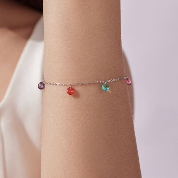 Ez az elegáns ezüst karkötő tökéletes választás, ha valami különlegeset keresel. Az 925 sterling ezüst alapanyag fehérarany-bevonattal van ellátva, amely elegáns fényt kölcsönöz a karkötőnek. A színes kristályok ragyogóan csillognak, ami minden pillantást magával ragad. Ez a finom ékszer ideális kiegészítője lehet bármilyen öltözéknek, legyen szó hétköznapi viseletről vagy különleges alkalmakról.