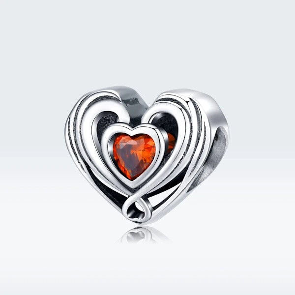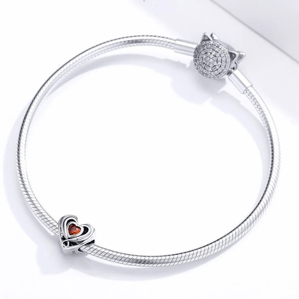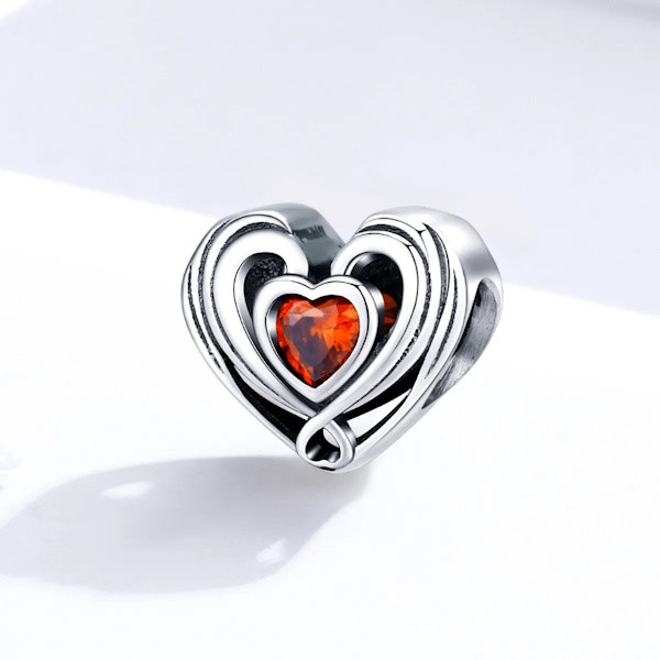 Fedezd fel az elegancia és a szeretet tökéletes kombinációját ezzel az ezüst szív a szívben charmmal! Kiváló minőségű 925 sterling ezüstből készült, és a piros cirkóniumkristály ragyogó csillogása teszi igazán különlegessé. Az oxidált felület finom kontrasztot ad, ami még inkább kiemeli a charm részleteit.