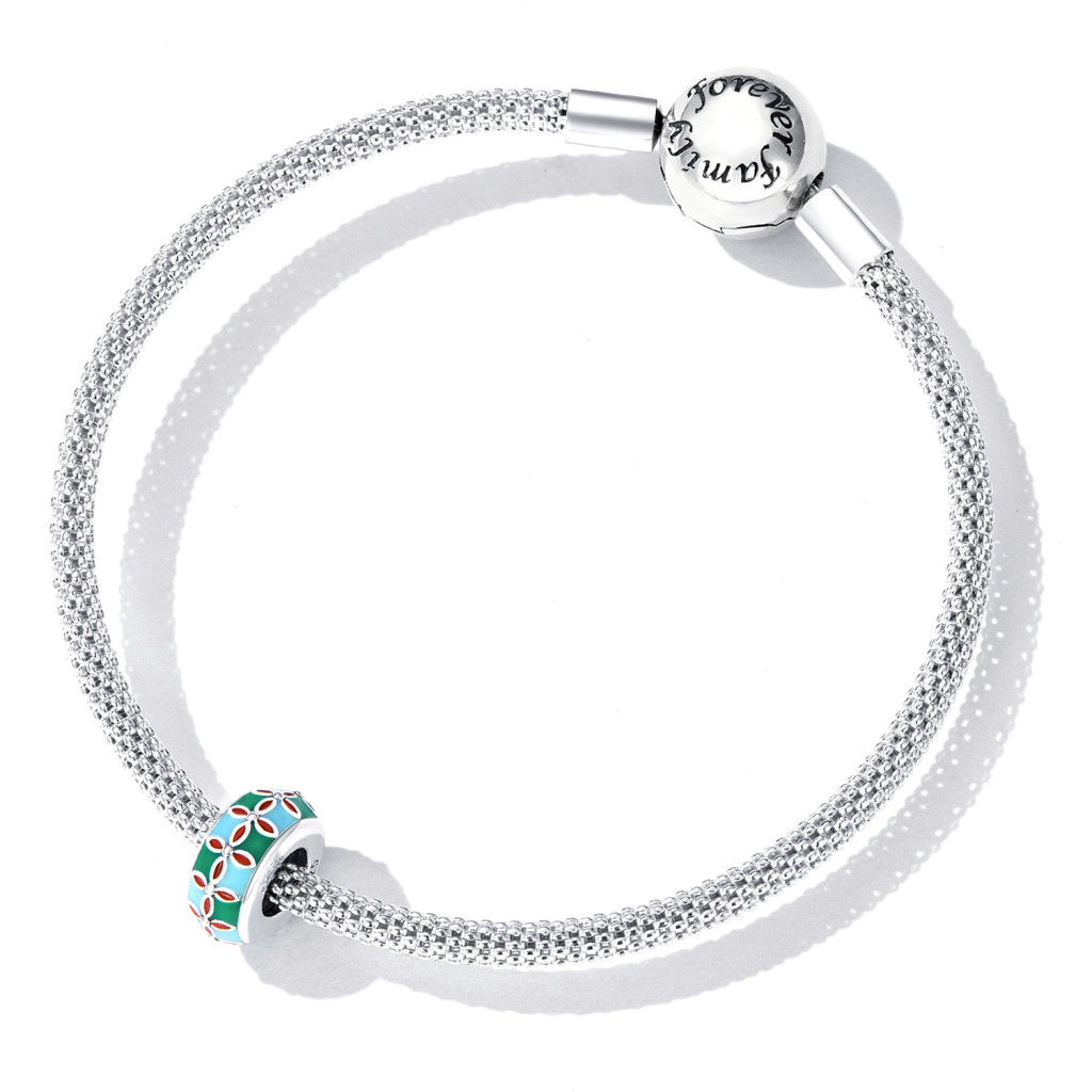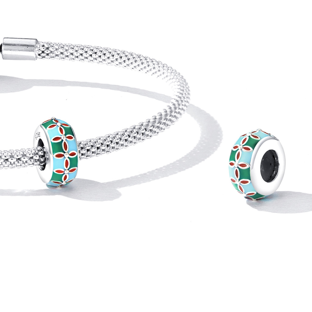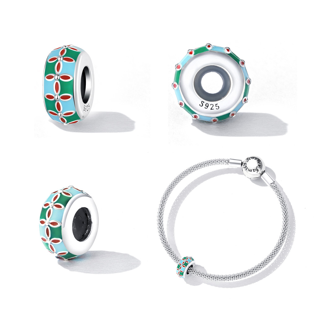 Ez a lótusz mintás elválasztó charm elegáns és modern kiegészítője lehet bármely ezüst karkötőnek. A charm 925 sterling ezüstből készült, színes, kézzel felvitt zománc díszítéssel, amely friss és nőies megjelenést biztosít. A türkiz, zöld és piros árnyalatok harmonikus összhangja a természet ihlette lótusz motívummal különleges, nyárias hangulatot teremt. A beépített szilikon betét segít, hogy a charm stabilan a helyén maradjon a karkötőn.