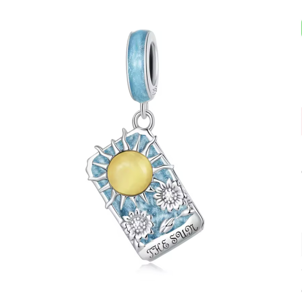 Ez a lenyűgöző, 925 sterling ezüstből készült tarot charm, amely a „The Sun” kártya motívumát viseli, az öröm és a siker szimbóluma. A finoman kidolgozott design sárga napsugarakkal és életteli virágmotívumokkal emlékeztet arra, hogy a boldogság és a vitalitás mindig jelen van az életünkben. Ez az ékszer tökéletes választás, ha valakit inspirálni szeretnél vagy ha Te magad szeretnél emlékezni arra, hogy a fény mindig benned rejlik. Ajándékozd meg vele magad vagy egy különleges személyt, hogy minden nap ragyogóvá váljon!