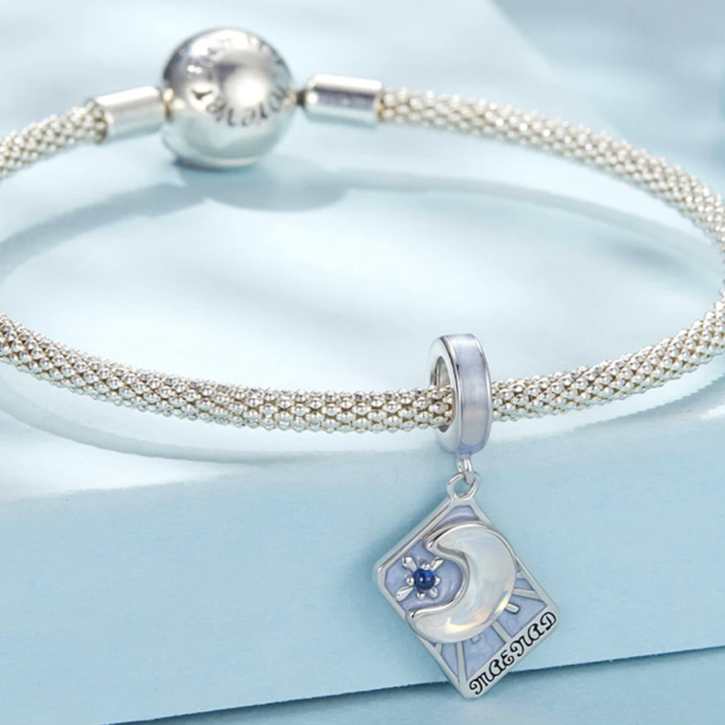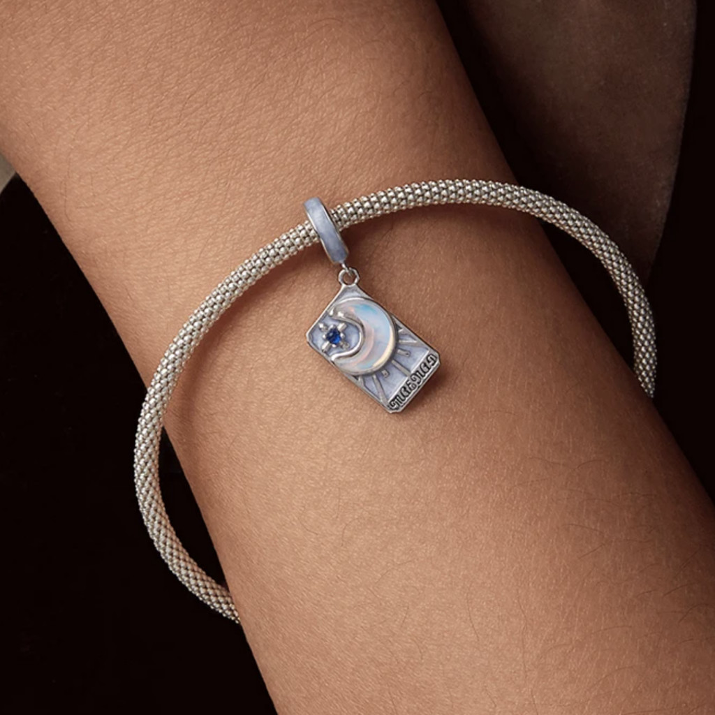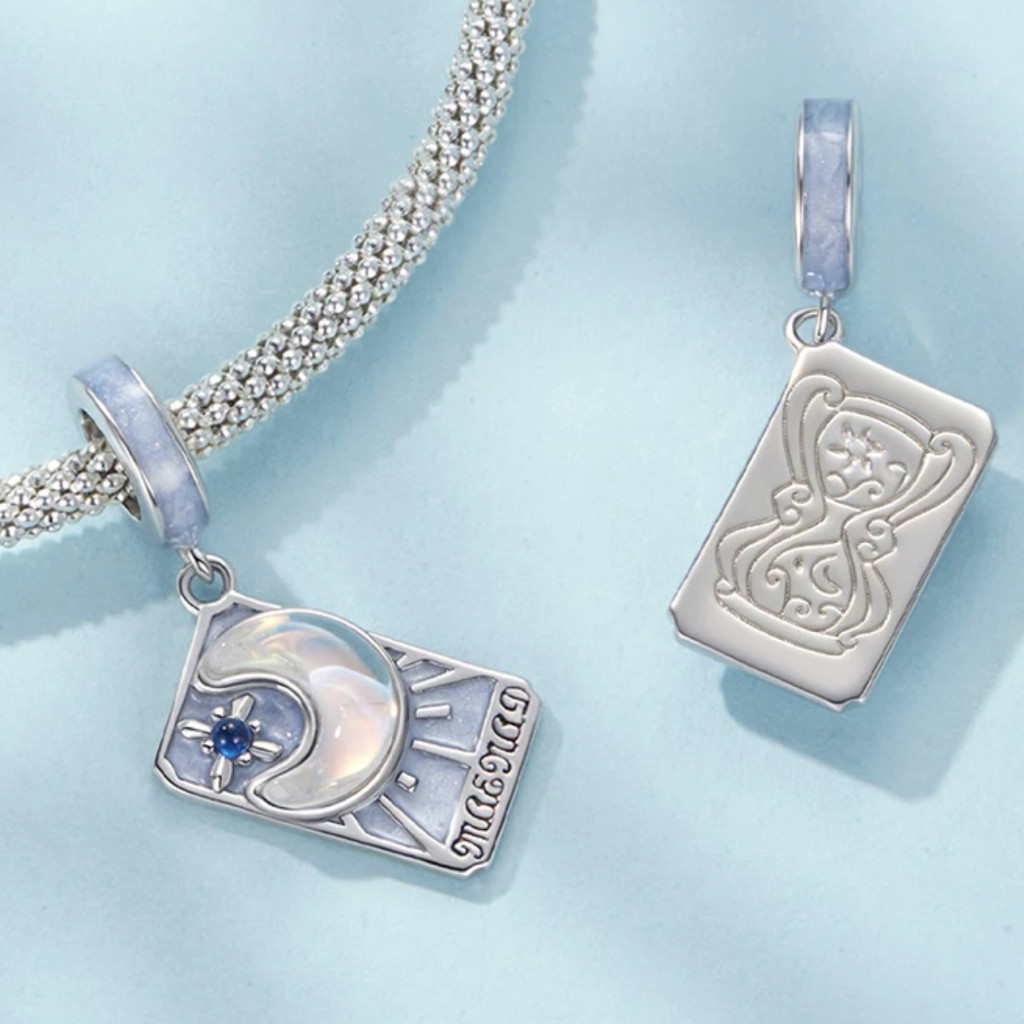 Merülj el a rejtély és intuíció világában ezzel a lenyűgöző ezüst charmmal, amely a tarot kártyák misztikumát hozza el számodra. A "The Moon" medál egy különleges ékszer, amely 925 sterling ezüstből készült, és csillogó hold alakjával hívogat az álmaid felfedezésére. A halványlila háttér és csillagmotívumok finoman tükrözik az éjszaka titokzatos, csendes erejét, amikor a lélek mélyebbre lát.