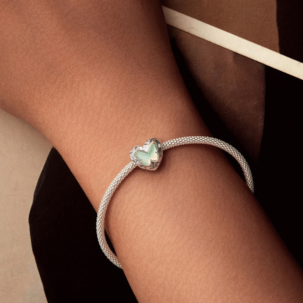 Ez a gyönyörűen kidolgozott, 925 sterling ezüstből készült charm igazi ékszerkülönlegesség, amely egy szív formába foglalt pillangót ábrázol. Finom részletei és letisztult eleganciája minden karkötőt vagy nyakláncot különlegessé tesz. A charm mérete 1.1 × 1.3 cm, és mindössze 2.2 g, így könnyedén viselhető a mindennapokban is.