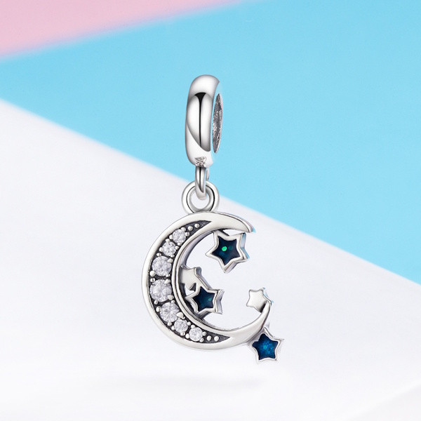 Ez a csodálatos ezüst charm, egy hold formájú ékszerdarab, amelyet apró csillagok ékesítenek. A 925-ös sterling ezüstből készült charm különleges ragyogást kap a cirkóniumkristályok által, amelyek finoman tükrözik a fényt, így bármilyen karkötőt vagy nyakláncot varázslatossá tesznek.
