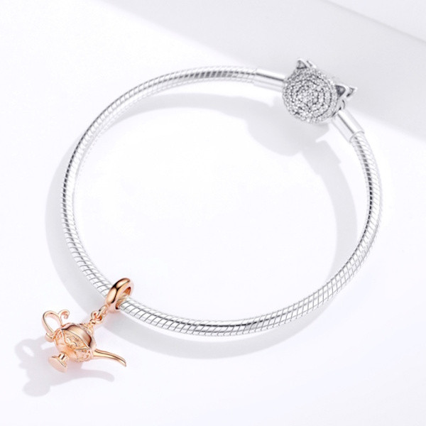 Engedd, hogy ez az elbűvölő ezüst charm gazdagítsa ékszerkollekciódat! A bájos teáskanna forma és a kifinomult rózsaarany bevonat tökéletes harmóniát alkot a ragyogó cirkóniumkristályokkal, melyek varázslatos csillogást kölcsönöznek ennek a különleges darabnak. A 925 sterling ezüst alapanyag garantálja a tartósságot és a minőséget, így mindennapi viselésre is ideális választás.