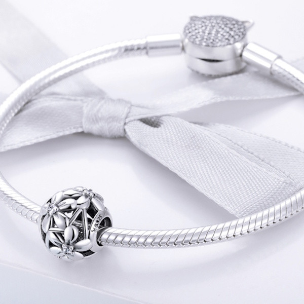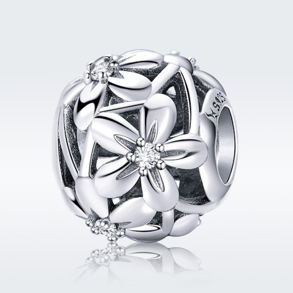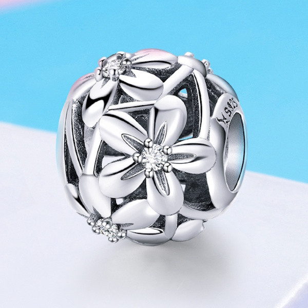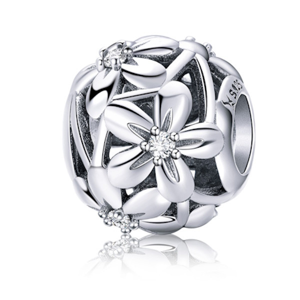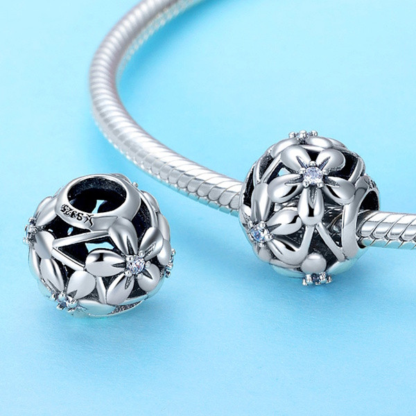 Ez a finom ezüst charm a természet szépségét hozza el számodra, az aprólékos virágmotívumokkal és a csillogó cirkóniumkristályokkal. A 925 sterling ezüstből készült darab eleganciát és stílust sugároz, miközben az apró kristályok ragyogása különleges fényt kölcsönöz neki.