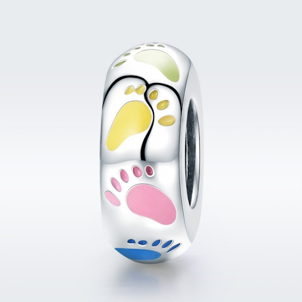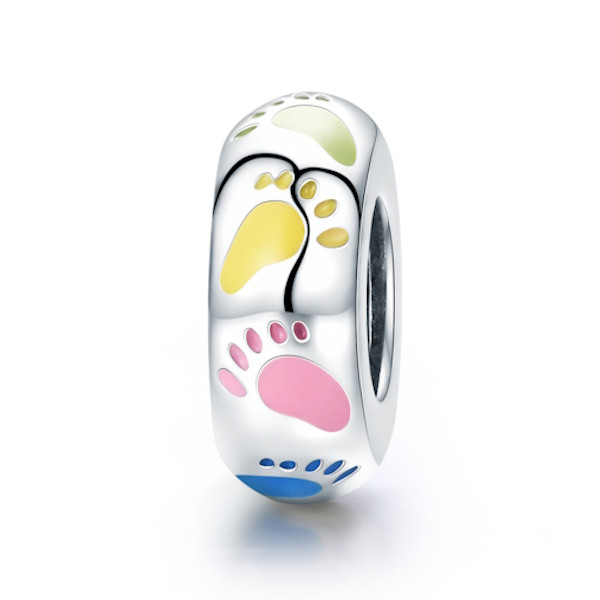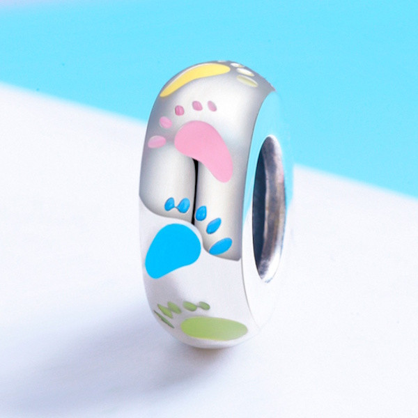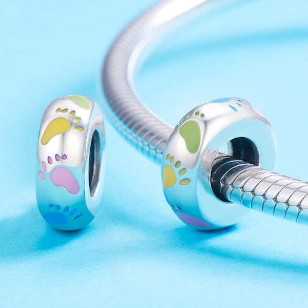 Az ezüst ékszerek szerelmeseinek tökéletes választás ez a különleges, lábnyomokkal díszített charm, amely 925 sterling ezüstből készült és színes zománcozással van gazdagítva. A charm finom kidolgozása és részletgazdagsága mindenkit elvarázsol, aki szereti az egyedi ékszereket. A mindössze 1.23 grammos súlyának köszönhetően kényelmesen viselhető karkötőn vagy nyakláncon is.