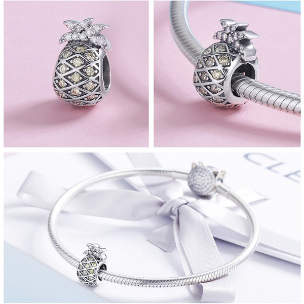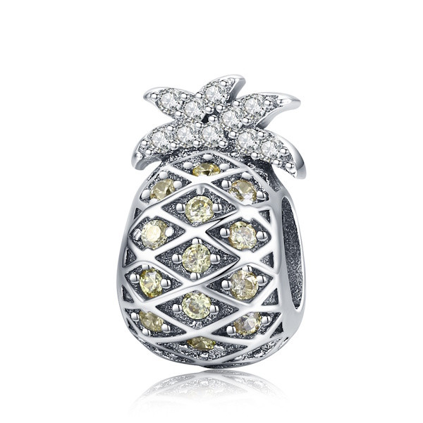 Tegyél egy kis trópusi varázst az ékszereid közé ezzel a lenyűgöző ezüst ananász charm-mal! A 925 sterling ezüstből készült darab cirkóniumkristályokkal van díszítve, amelyek csillogó fényt adnak neki, minden szögből nézve. Az ananász szimbolikusan a vendégszeretetet és a barátságot jelképezi, így tökéletes ajándék lehet egy kedves barát számára.