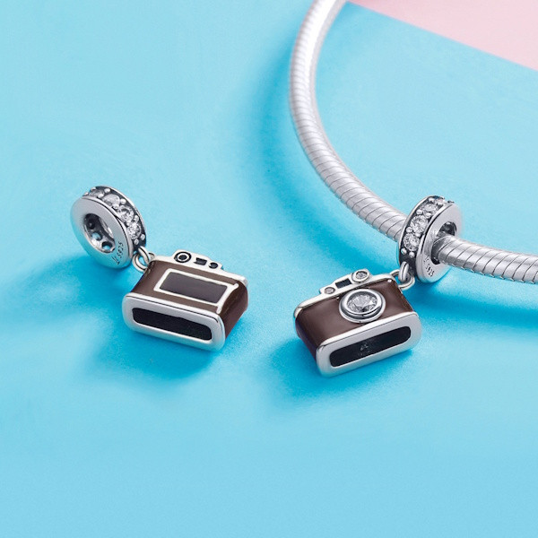 Ez a különleges ezüst charm tökéletes választás minden fotózás szerelmese számára. A 925 sterling ezüstből készült, részleteiben gazdag fényképezőgép alakú charm nem csupán stílusos, de egyedi megjelenést is biztosít bármilyen ékszerhez. Az oxidált felület kiemeli a barna zománcozás finomságát, míg a fehér cirkóniumkristály ragyogó csillogást kölcsönöz neki.