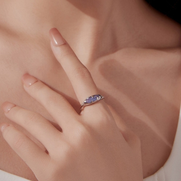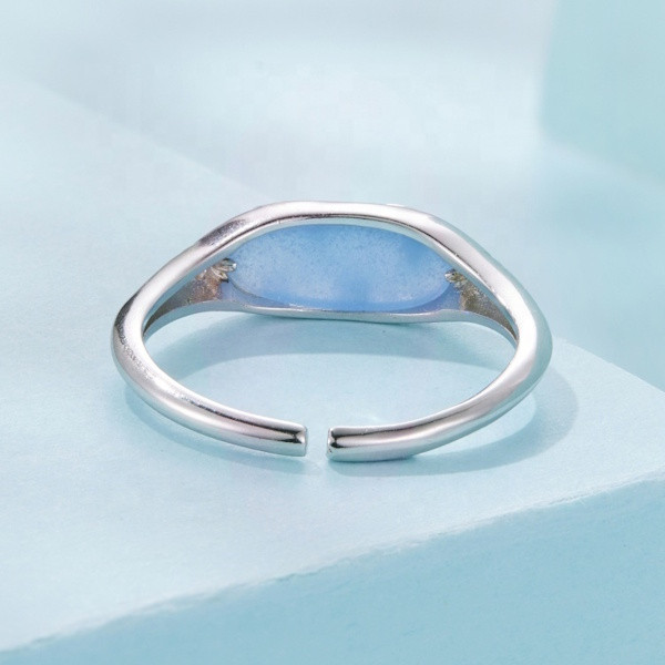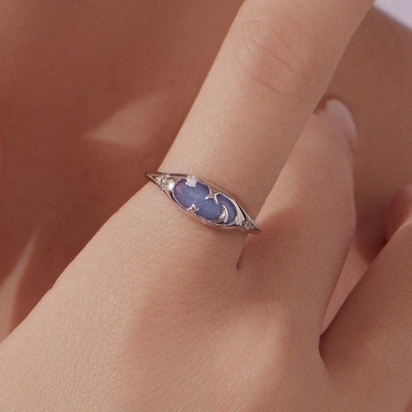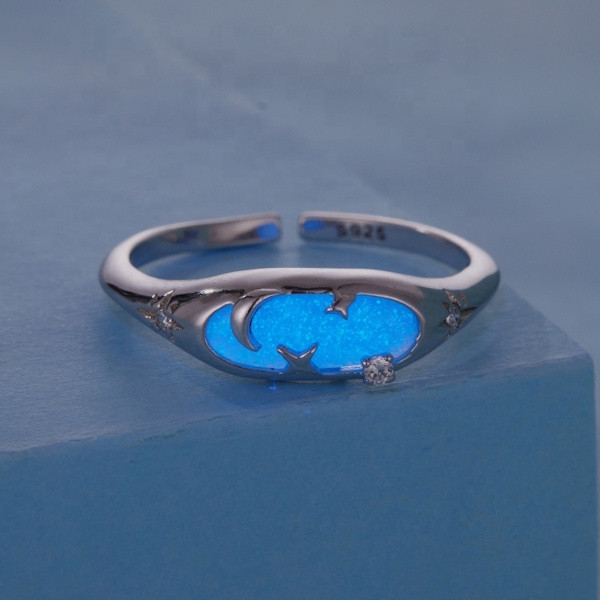 Ezüstből készült, állítóható méretű, foszforeszkáló női gyűrű fehérarany-bevonattal. Szélessége 0.16-0.6 cm, súlya 1.9 g.