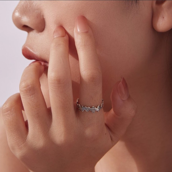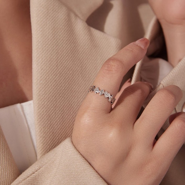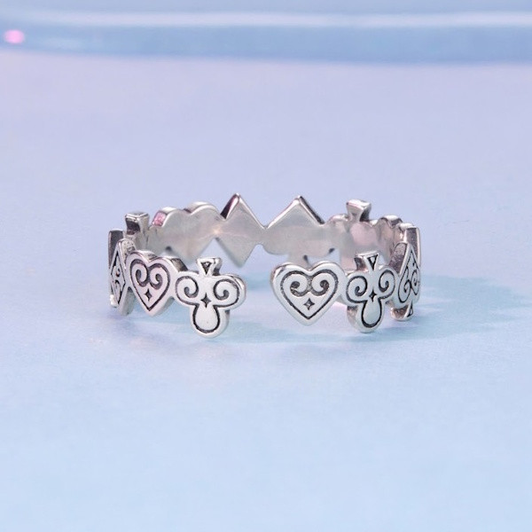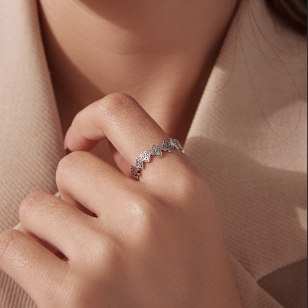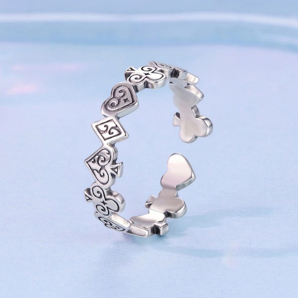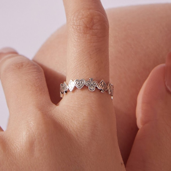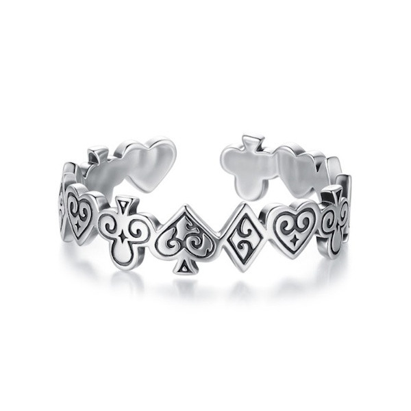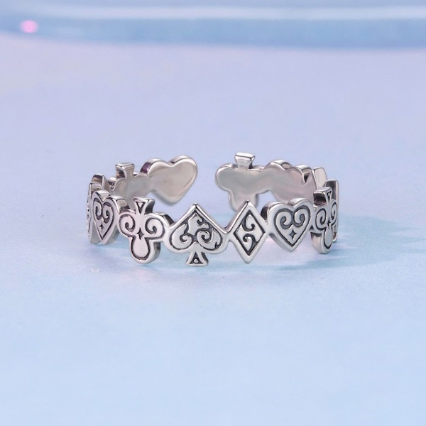 Oxidált ezüstből készült, állítható méretű női gyűrű a römikártya ábráival díszítve. Szélessége 0.5 cm, súlya 1.8 g.