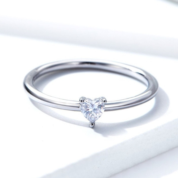 Ezüstből készült női gyűrű platinabevonattal és szív alakú fehér cirkóniumkristállyal. Szélessége 0.15 cm.